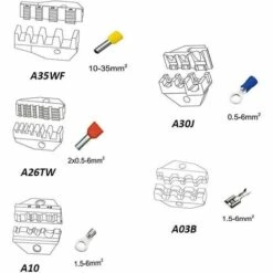 5 PAIRE D’INSERTS INTERCHANGEABLES – – A03B (Pour 1.5 – 6 mm²): Pour les raccords plats non isolés; A26TW (Pour 2*0.5 – 6 mm²): Pour les douilles isolées et non isolées; A10 (Pour 1.5 – 6 mm²): Pour les terminaux non isolés; A30J (Pour 0.5 – 6.0 mm²): Pour les terminaux isolés; A35WF (Pour 10 – 35 mm²): Pour les douilles non isolées