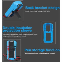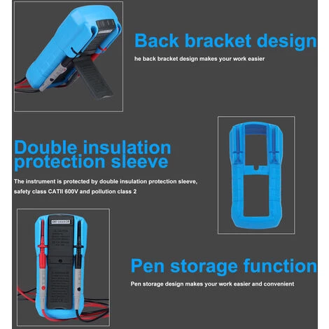 Fonctionnalites: ecran LCD, lisez clairement la valeur affichee. Maintien des donnees, test de frequence, test de diode, test marche-arret du circuit, diverses fonctions sont disponibles pour vous de choisir. Il y a une prise de sonde de haute qualite a l’arriere, la repartition des details du travail, la conception du support arriere, afin que vous puissiez travailler facilement et commodement. L’instrument est protege par une gaine de protection a double isolation, avec une classe de securite de catii600v et une classe de pollution de 2. Il vous rend plus sur et plus assure.