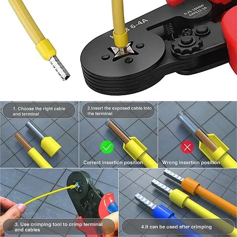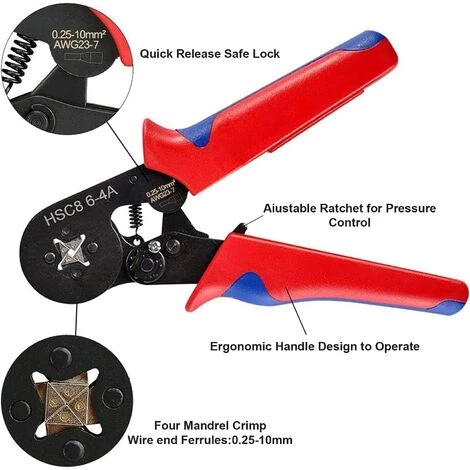 【Outil de Sertissage Auto-Ajustable】La force de pression peut être réglée au moyen d’une roue de réglage, qui est fixée par une vis. L’atelier de presse s’adapte automatiquement aux manchons isolants respectifs, autobloquant et auto-libérant pour économiser 50% d’énergie lors du sertissage.