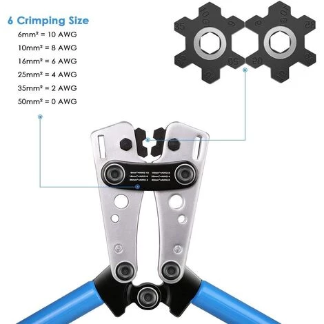 6 matrices de sertissage: 6 mm² / 10 mm² / 16 mm² / 25 mm² / 35 mm² / 50 mm² (similaire à AWG 10/8/6/4/2/0) pour le sertissage dTaille de fil 0 – 10AWG.