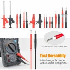 - 【Le forfait comprend】 : Le multimètre à câble comprend 21 accessoires remplaçables, qui sont : différents types de sondes * 10, pinces crocodiles * 2, pinces de test * 1, grands crochets de test * 2, petits crochets de test * 2, fiche banane * 2, cordon d’essai * 2