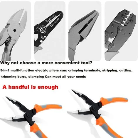 La pince électrique multifonction 5 en 1 peut : sertir les bornes, dénuder les fils, couper les fils, couper les bavures et couper les fils