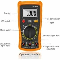 Paramtres principaux: ce multimtre numrique a une valeur de mesure maximale de 1999. Ce multimtre peut tre utilise pour la mesure de: tension CC jusqu’ 1000V, tension CA jusqu’ 750V, courant CA/CC jusqu’ 20A, rsistance jusqu’ 200M, capacit jusqu’ 200mF. Appropri pour mesurer la tension CA/CC, le courant CA/CC, la rsistance, la frquence, la capacit, la continuit, la diode, etc.