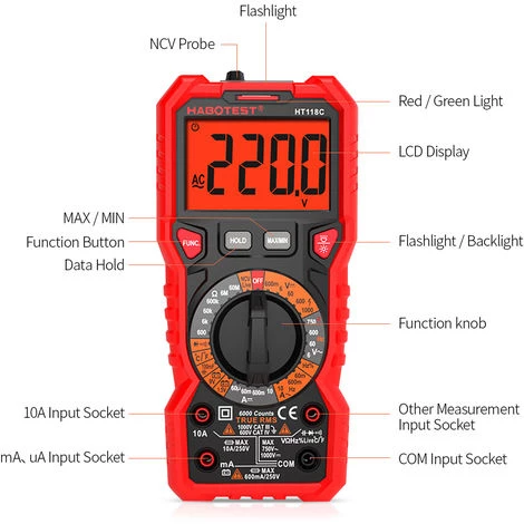 « Caractéristiques:Large plage de mesure: pour la mesure de courant continu / courant alternatif, courant continu / alternatif, résistance, capacité, test de diode, test de NCV, le test en direct, test de la batterie, fréquence, température, etc.Plage de température: Gamme de test est de -40 ~ 1000 ° C / -40 ~ 1832 ° C, ° C / ° F conversion d’unité.2.7″ » Grand écran LCD: 59 * 36mm écran LCD avec grand-lecture numérique et rétro-éclairage pour une lecture claire.Mise hors tension automatique: arrêt automatique si 15mn il n’y a pas d’opération, plus d’économie d’énergie.Portable Design: support à l’arrière pour soutenir multimètre, et il peut également être accroché au mur.Protection contre les surcharges: intégré à double fusible, une protection complète pour un fonctionnement en toute sécurité.Autres fonctions: Max / min Maintiens, contenir des données, continuité, RMS vrai, indication de batterie faible, rétro-éclairage de couleur double, prise d’entrée LED indiquent, lampe de travail, etc. Caractéristiques:Matériel: ABSAffichage: 6000 comptesGamme: Gamme manuelleAffichage: LCDBande passante: 1kHzSécurité Note: EN61010-1, EN61010-2-033 -2-030, EN61326-1 CAT III 1000V, CATIV 600VDC Tension: 600mV / 6V / 60V / 600V / 1000VTension AC: 6V / 60V / 600V / 750VDC actuel: 60uA / 60mA / 600mA / 6A / 10AAC: 60mA / 600mA / 6A / 10ARésistance: 600? / 6k? / 60K Ohms / 600k? / 6M? / 60M?Capacitance: 10nF / 100nF / 1 uF / 10?F / 100?F / 1mf / 10mF / 100mFFréquence: 10 Hz / 100 Hz / 1 kHz / 10 kHz / 100 kHz / 1 MHz / 10MHzDuty: 1 ~ 99%Température: -40 ~ 1000 ° C / -40 ~ 1832 ° FAlimentation: 2 piles AA * (non inclus)Taille de l’écran: 59 * 36mm / 2,32 * 1.42inPoint Taille: 88 * 58 * 188mm / 3,46 * 2,28 * 7.40inPoids de l’article: 418g / 14,74 ozPoids du paquet: 495g / 17,46 ozTaille du paquet: 20.5 * 13 * 6cm / 8,07 * 5,12 * 2.36in Liste des paquets:1 * Compteur1 * Paire de Test Lead2 * Sonde1 * Manuel (Anglais) »