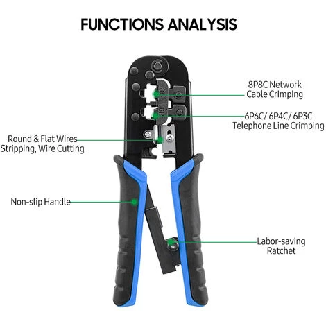 Convient pour sertir le câble réseau 8P8C et les connecteurs de ligne téléphonique 6P6C/ 6P4C/ 6P3C, dénuder les fils ronds et plats.