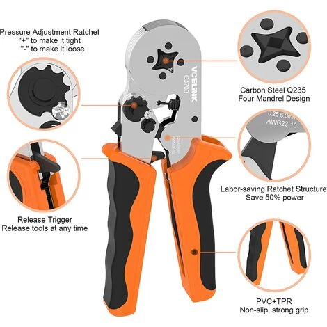 Facile à utiliserLorsque vous l’utilisez, desserrez-le doucement, faites-le glisser lorsqu’il n’est pas utilisé et assemblez-le. | Gamme d’utilisationLarge plage de compression jusqu’à 0,25-6 mm². Plusieurs fils de différentes tailles peuvent être sertis. | Adjustable pressure settingAdjust the pressure for a variety of terminations, more convenient. | Poignée ergonomiqueAvec un revêtement antidérapant, vous pouvez travailler confortablement d’une seule main. |