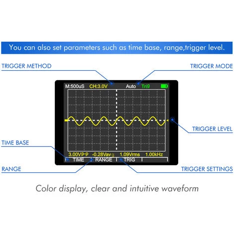 | Fait de matière fine de la qualité, pratique, facile à utiliser et à utiliser, une large gamme d’applications, a une longue durée de vie. Fonctionnalités: Oscilloscope multimètre 2 en 1, d’améliorer l’efficacité de votre travail. oscilloscope à un seul bouton: aucune sonde de l’oscilloscope besoin, forme d’onde de mesure directement. Mesure rapide et précise, affichage de forme d’onde claire. 240 * 320 écran couleur haute définition: l’affichage de la couleur est plus claire, et l’affichage secondaire en bas fournit plusieurs menus de fonctions. Multimètre fonctions de mesure: tension AC / DC, le courant AC / DC, résistance, capacité, la fréquence, le rapport cyclique, test de diode, test de continuité. Stockage: stockage de masse, 100 / données 10 formes d’onde. Triple sécurité: double tube d’assurance, 500mA / 250V, 10A / 250V. la tension d’entrée est supérieure à 24 V, un avertissement sonore une fois. Entrée sur toute la plage, l’alerte sonore. affichage de l’écran même: des documents historiques et les données en temps réel sont affichés sur le même écran pour la comparaison et l’analyse facile des données. Boutons et cadran: Bouton silicone, sélecteur de fonction pression sensible, engrenage précis. support arrière: le support arrière est incliné à 60 ° pour faciliter la visualisation. Caractéristiques: Matériel: ABS La couleur noire Affichage: 320 * 240 LCM Zone d’affichage: environ 2,4 pouces Contre-jour: blanc Résistance d’entrée: 10M Batterie: 3 * piles AA (non incluses) Consommation: environ 80mA L’emploi du temps: faible luminosité environ 5 heures Stockage: 100/10 formes d’onde de données Utilisez environnement: 0 ~ 40 ℃, <75% Environnement de stockage: -10 ~ 60 ℃, <90% d’humidité relative Bande passante: ACV / 1MHz ACA / 5kHz Max. taux d’échantillonnage en temps réel: 2.5Msps mesure Multimètre: plage automatique + gamme manuelle Fonction oscilloscope affichage secondaire: VP-P, la valeur moyenne, la valeur efficace, la fréquence, la base de temps, l’amplitude Mode de mesure: normal, automatique Taille de l’article: 160 * 83 * 32mm / 6.3 * 3.3 * 1.3in Poids de l’article: 195g / 6,9 oz Taille de l’emballage: 190 * 140 * 45mm / 7.5 * 5.5 * 1.8in Poids du paquet: 370g / 13,1 oz Spécification Multimètre: Tension continue: Gamme: 400mV / 4V / 40V / 400V / 1000V Incertitude: 0,75% v + 10dgt tension alternative: Gamme: 400mV / 4V / 40V / 400V / 750V Incertitude: 1,0% v + 10dgt Courant DC: Gamme: 40mA / 400mA / 4A / 10A Incertitude: 1,2% RDG + 10dgt courant alternatif: Gamme: 40mA / 400mA / 4A / 10A Incertitude: 1,5% RDG + 10dgt La résistance: Gamme: 400.0Ω ~ 40.00MΩ Incertitude: 1,0% v + 5dgt Capacitance: Gamme: 0.1nF ~ 100, 10.00mF Incertitude: 2,0% v + 10dgt La fréquence: Plage: 5 Hz ~ 10MHz Incertitude: 1,0% v + 5dgt Cycle de service: Plage: 0,1% ~ 99,9% Incertitude: 1,0% v + 5dgt Test de diodes: tension est d’environ 5 V, courant de test est d’environ 1,5 mA Test de continuité: résistance au jugement sur: <bip 50Ω Fusible Spécifications: 500mA / 250V, 10A / 250V Liste de colisage: 1 * graphique Multimètre 1 * Paire de stylos de test 1 * Sac de protection 1 * Manuel de l’utilisateur |