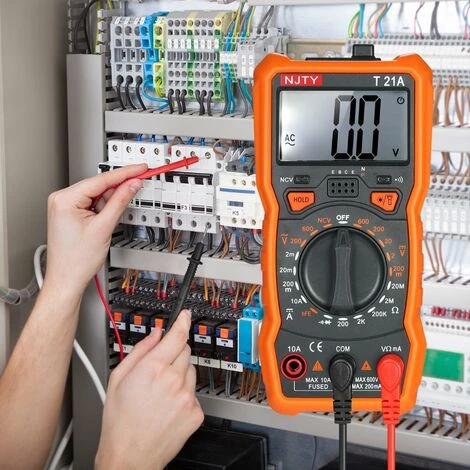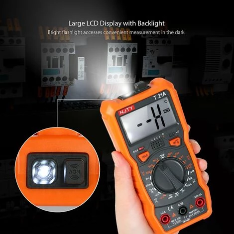 tension, courant continu, résistance. Il peut également tester NCV (tension sans contact), transistor hFE, diode et continuité. Avec un support à l’arrière, pratique pour le poser sur la table et lire les valeurs.