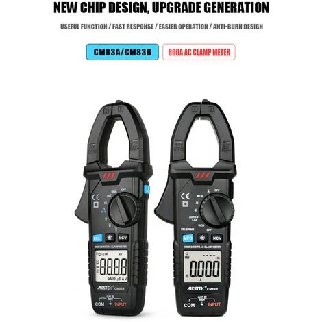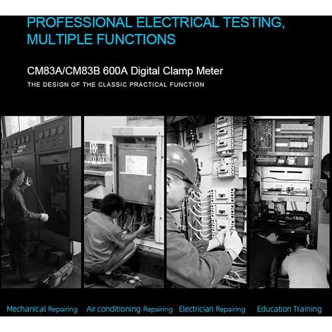 Fonction CM83B : gamme automatique, courant alternatif 600 A, mesure de résistance (0-10 MΩ), continuité/diode, mesure de capacité, tension continue 600 V, tension alternative 600 V, détection de tension alternative sans contact NCV, lampe de poche/rétroéclairage à pince, maintien des données, True -RMS, AUTO-LoZ, contrôle de protection contre les courants de fuite RCD, mesure de courant à fréquence variable.