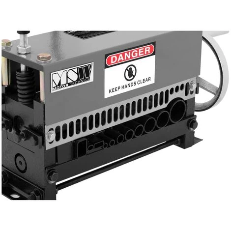 Grâce au dénudeur manuel MSW-WS-005 de MSW, vous pourrez retirer rapidement et avec précision l’isolant des câbles et fils électriques et ce, avec une extrême facilitée. Cet appareil professionnel fonctionne parfaitement là où les autres moyens de dénudage traditionnels échouent. La machine à dénuder convient pour un ou plusieurs câbles en cuivre. La machine à dénuder, compacte et robuste, est parfaitement adaptée pour être utilisée dans le domaine industriel. L’appareil est fabriqué en tôle d’acier solide et s’actionne manuellement grâce à un levier d’actionnement fluide. Un mécanisme spécial actionne la roue dentée interne et permet alors d’initialiser le dénudage. Avec ses 11 cavités d’insertion pour câble, cet appareil possède de nombreuses possibilités d’utilisation. Huit cavités conviennent pour les câbles ronds et trois pour les câbles plats dont les diamètres mesurent de 1,5 mm jusqu’à 38 mm. Le dénudeur électrique travaille avec une tête de coupe cylindrique. Un rouage achemine le câble le long de la lame rotative et retire, en une coupe précise, l’isolant du câble. Grâce à la remarquable qualité de la coupe, l’isolant peut être retiré immédiatement après et ce, simplement et proprement.