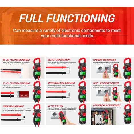 | Un compteur de serrage professionnel qui peut tester la tension AC / DC, courant alternatif, la résistance, diode et détecter le point de rupture, la reconnaissance de firewire, zéro identification de la ligne claire écran LCD rétro-éclairé vert, une a 1999 la valeur d’affichage maximale. Traits: Caractéristiques: |