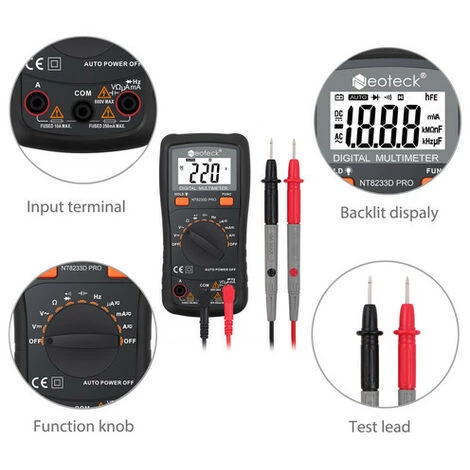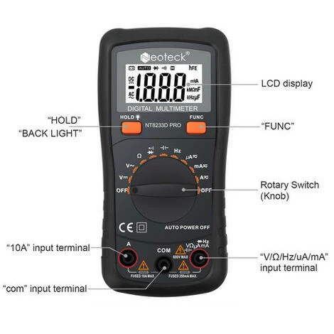 - La série d’instruments 8233D PRO utilisant l’écran LCD 15 mm avec rétroéclairage, même dans des endroits peu éclairés, peut clairement lire la valeur d’affichage. Il s’agit d’une gamme automatique de multimètre numérique portable à 3 1/2 chiffres, haute performance et haute fiabilité. Ce compteur est conçu pour répondre à la catégorie de surtension IEC 61010-1 et CAT II 600V et à la double isolation. Le compteur avec étui qui donne au corps principal, bien que réduit, une résistance élevée contre le choc d’une chute.