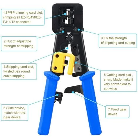 Outil de sertissage RJ45 professionnel – Il s’agit d’une sertisseuse ez via Ethernet polyvalente pour connecteurs Internet traditionnels RJ45 / RJ11 / RJ12, sertisseuses modulaires RJ45 pour applications de transmission de voix et de voix. OpĂ©ration prĂ©cise et rapide, coupe, dĂ©nudage et sertissage faciles.
