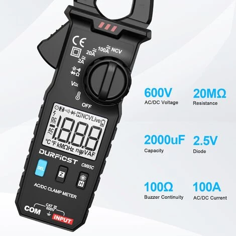 - 【Mesure précise】: La pince ampèremétrique utilise des têtes de serrage de haute précision, qui peuvent mesurer le courant AC/DC sans endommager la surface du fil, et peuvent mesurer avec précision avec une résolution allant jusqu’à 1 mA ; courant AC/DC (100 A), AC /tension continue (600V)