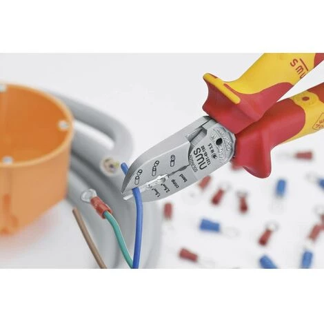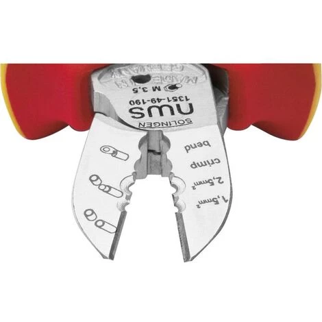 Cette pince coupante diagonale universelle 6 en 1 possède des tranchants de précision trempés par induction pour coupe de fils plus souples. Fonction de sertissage pour comprimer les cosses non isolées et isolées. Fonction de dénudage 1,5 mm² et 2,5 mm² pour fils mono-et multiconducteurs. Surface chromée mate.