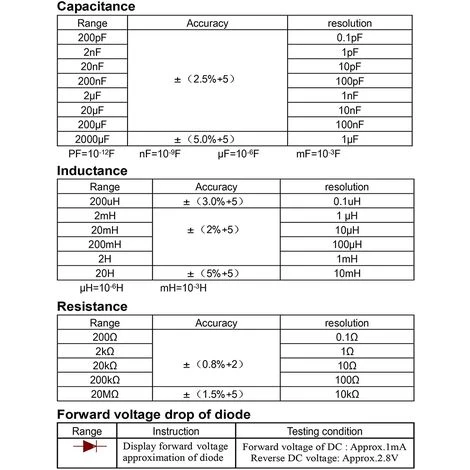 - 【Plage de mesure】Capacité : 200pF/2nF/20nF/200nF/2uF/20uF/200uF/2000uF, Précision : 2,5%. Inductance : 200uH/2mH/20mH/200mH/2H/20H,Précision : 2,5%. Résistance : 20Ω/200Ω /2kΩ/20kΩ/200kΩ/20MΩ, Précision : 0,5 %.