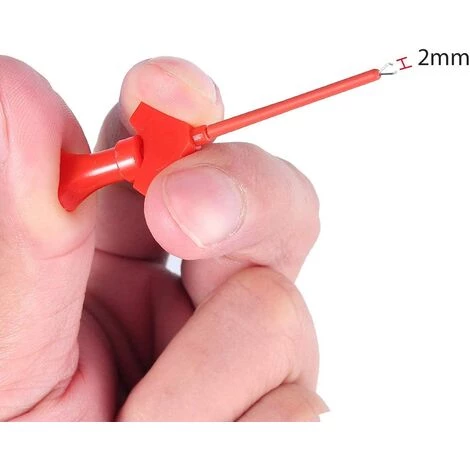 La mini-pince de test de 2 mm avec ressort intrieur a un crochet de clip rtractable et un cble d’extension, qui garantissent des connexions scurises pour les bornes et les borniers de tous types. .