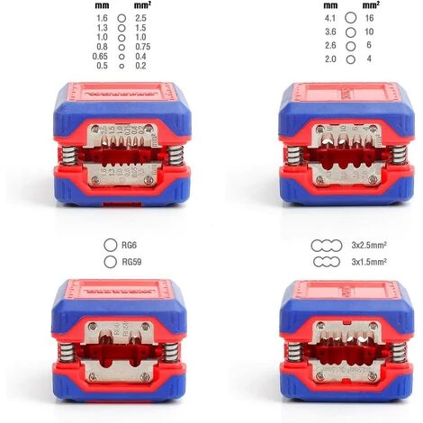 Multifonctionnel et pratique Ct de face pour le diamtre des cbles 0,5-0,65-0,8-1,0-1,3-1,6 mm, la surface de coupe transversale 0,2-0,4-0,75-1,0-1,5-2,5 mm. Ct gauche pour le diamtre des cbles 2,0-2,6-3,6-4,1 mm, la surface de coupe transversale 4-6-10-16 mm. Ct droit pour cble conducteurs multiples 31,5 mm, 32,5 mm et ct de dos pour cble coaxial RG 59-RG 6.
