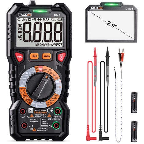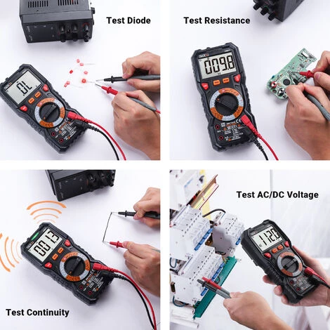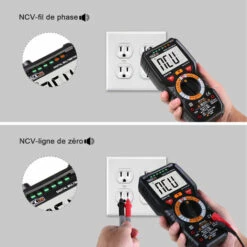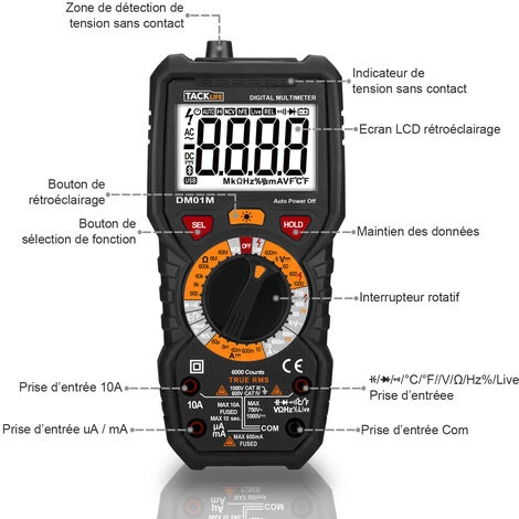 – en plus de mesurer la tension AC/DC, le courant AC/DC, la résistance, la diode, la capacité, la fréquence Transitor, la température et a une fonction de fil sous tension à mesurer et de ligne zéro avec le test à deux fils.